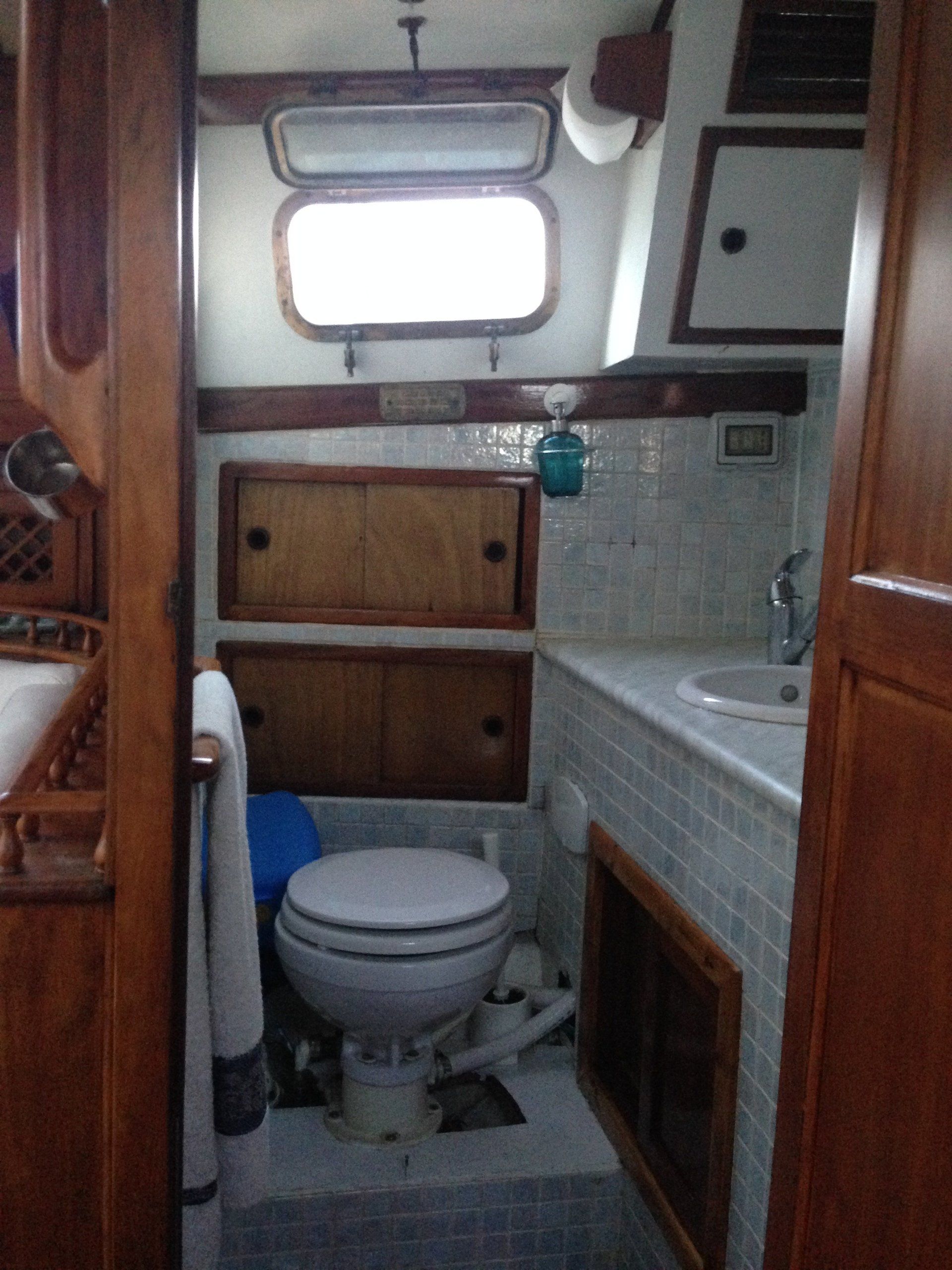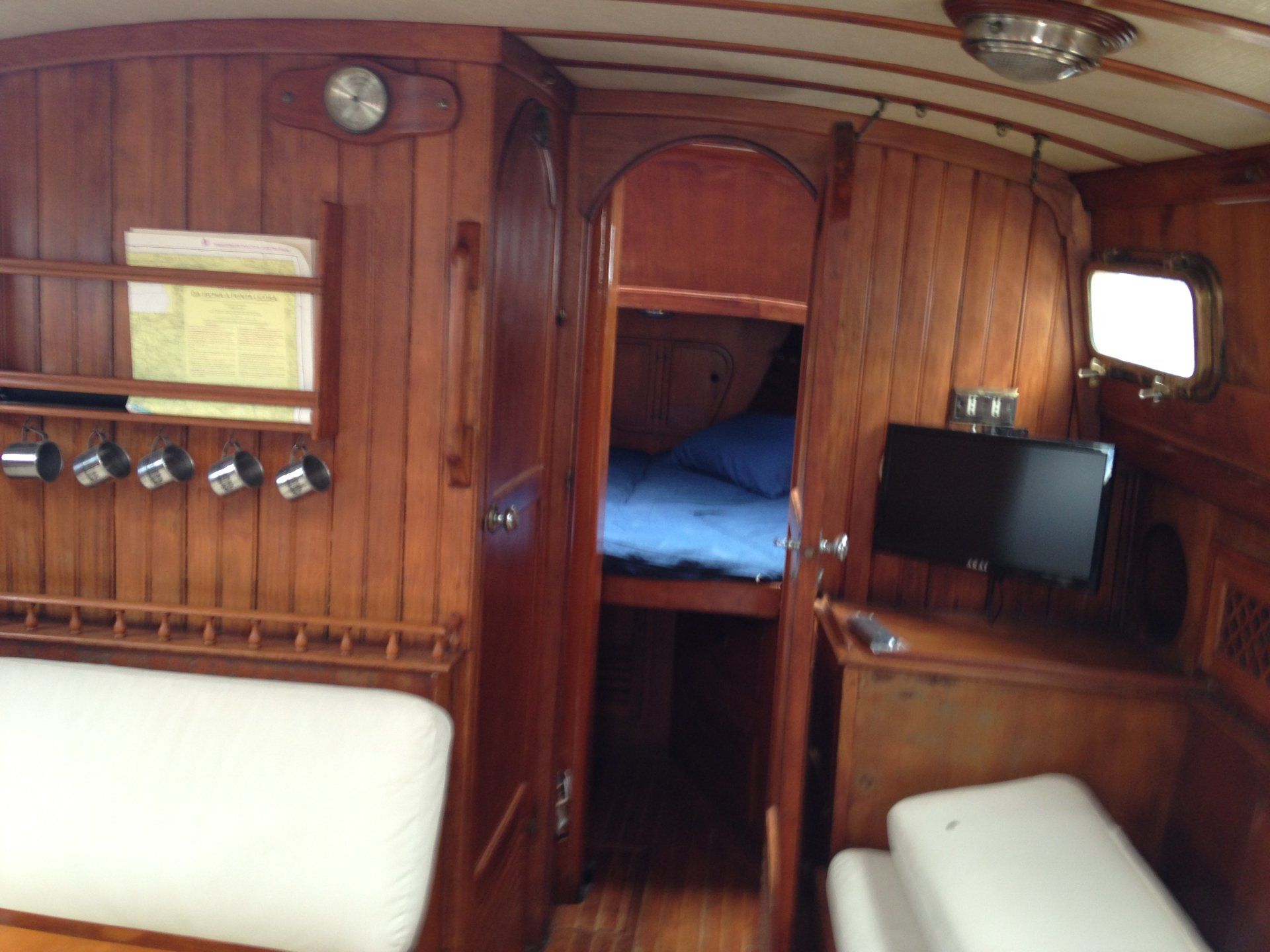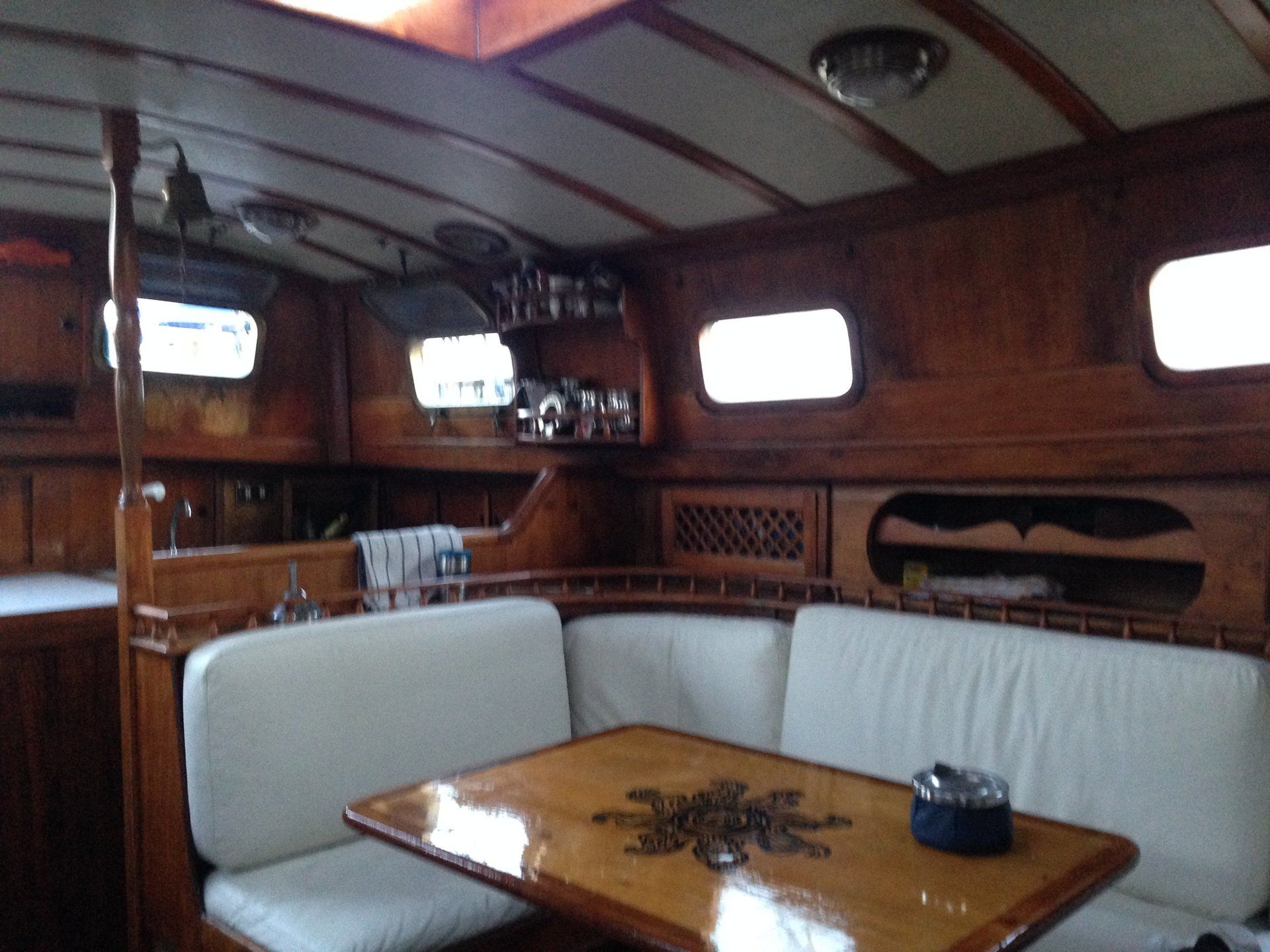 Il comfort della dinette con tutto il fascino antico del teak a pannelli, i cassettoni a traliccio attorno a un tavolo in teak scintillante che ospita comodamente sei persone. La panca laterale di dritta offre posti a sedere supplementari e, in caso di necessità, sia la panca che il tavolo possono essere facilmente convertiti in cuccette ospiti.